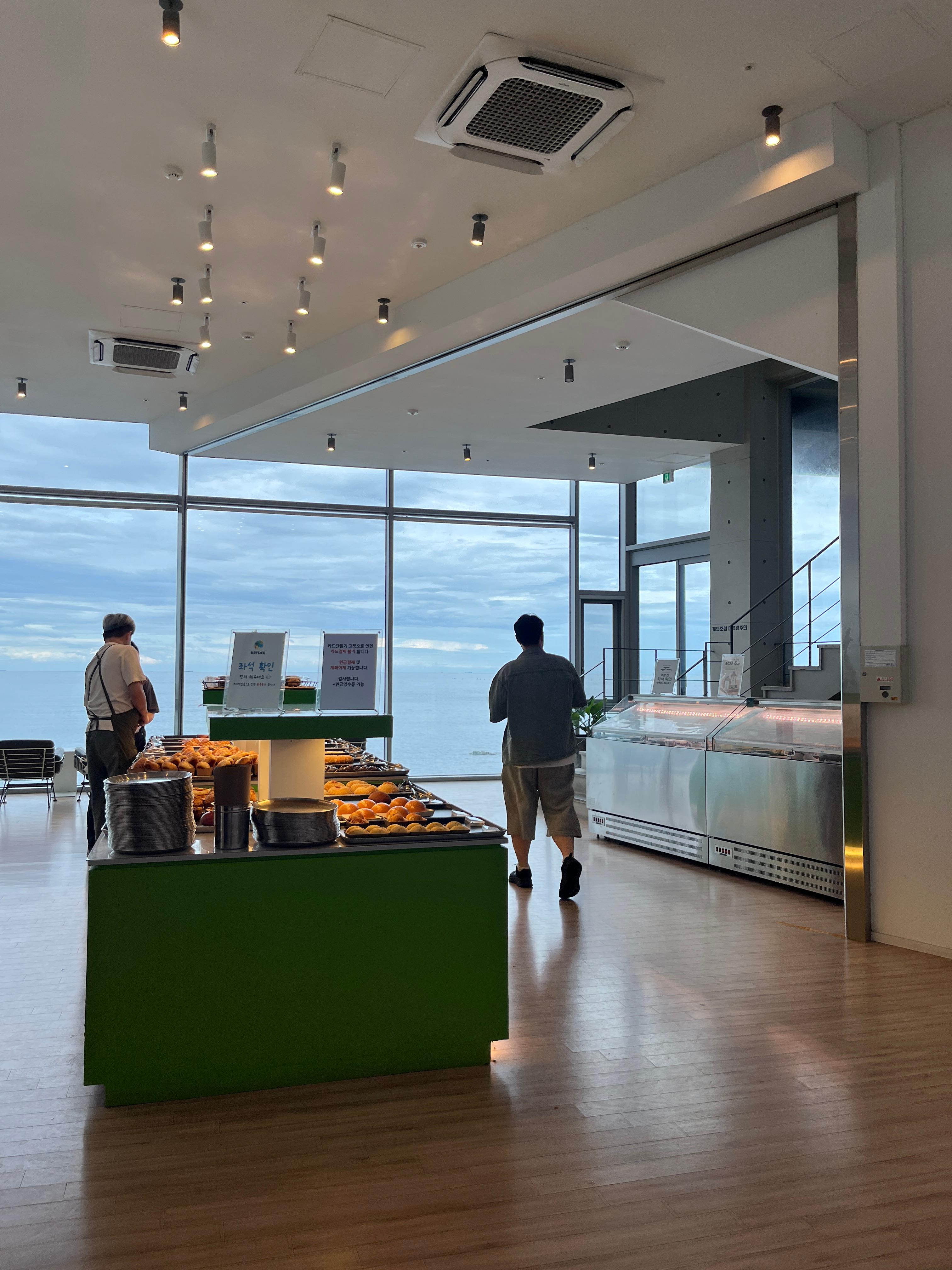주말임에도 불구하고 날씨 덕분에 사람이 적어 한적하게 카페를 즐길 수 있었던 것도 큰 장점이었어요. 실내 공간도 매우 넓고, 테이블 간 간격이 넓어 프라이빗하고 편안하게 대화를 나눌 수 있었습니다. 창밖으로 보이는 오션뷰는 그 자체로 힐링이 되는 풍경이었어요.