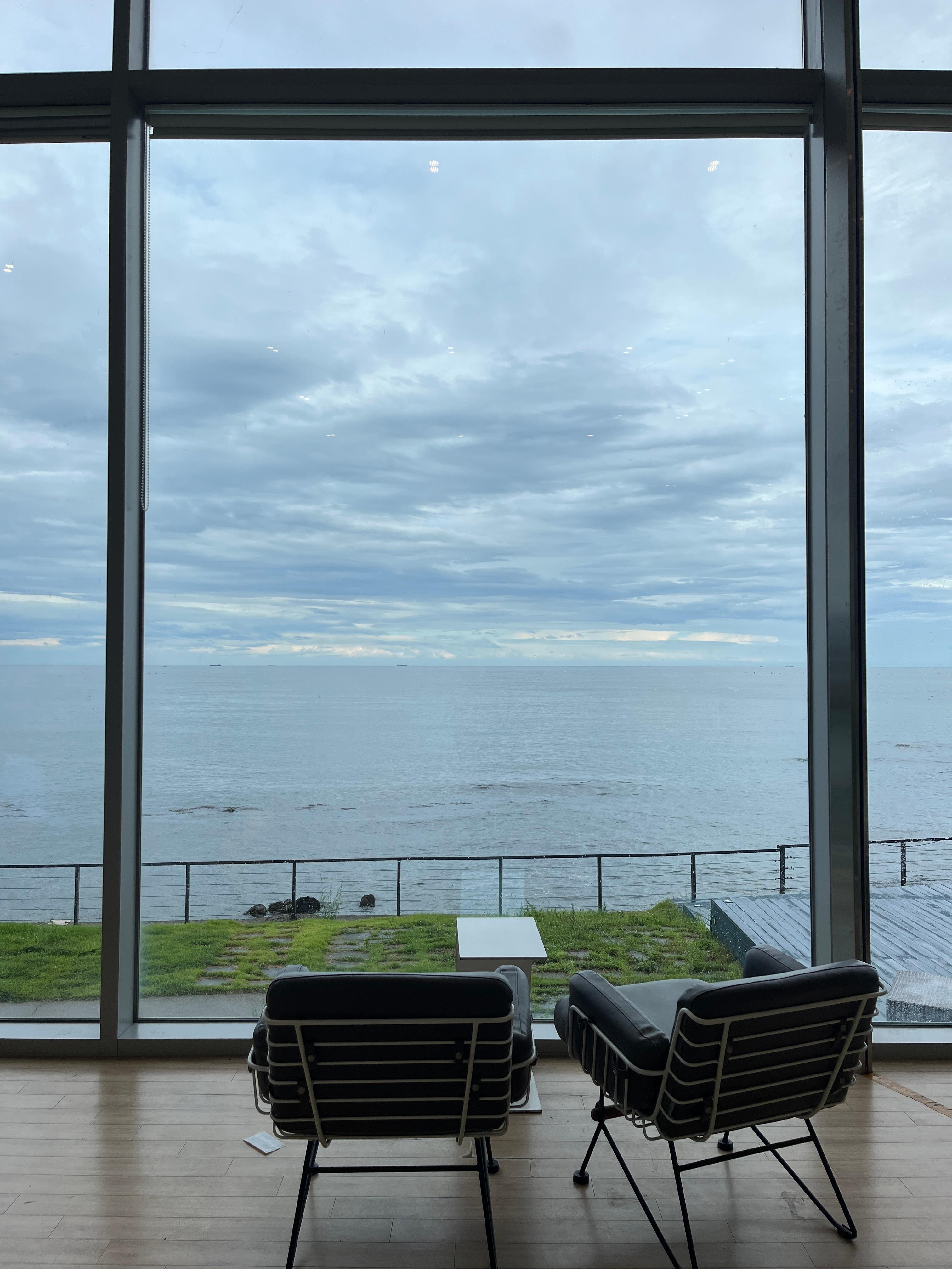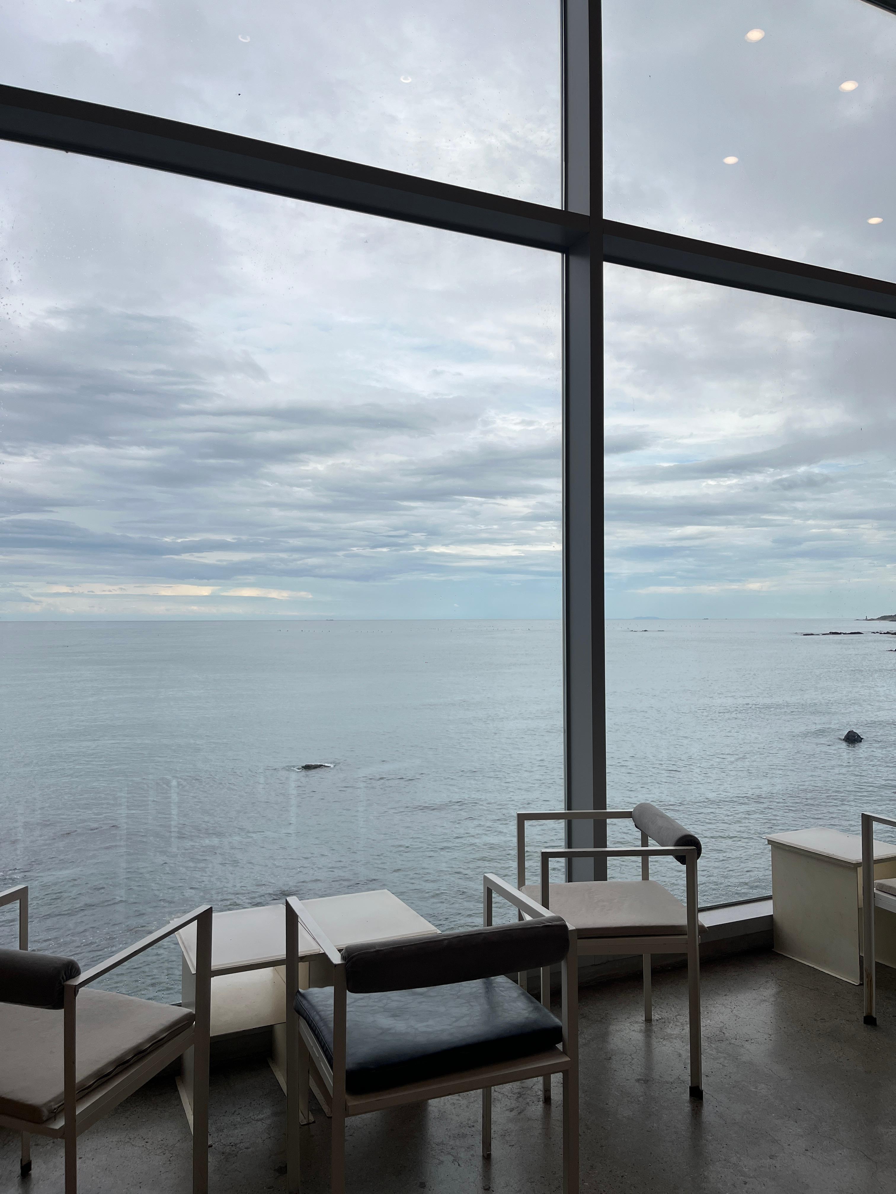 * 창밖으로 펼쳐지는 몽환적인 바다 풍경: 비에 젖은 바다는 맑은 날과는 또 다른 매력을 선사합니다. 흐린 하늘과 맞닿은 바다의 모습은 마치 한 폭의 그림 같았어요.