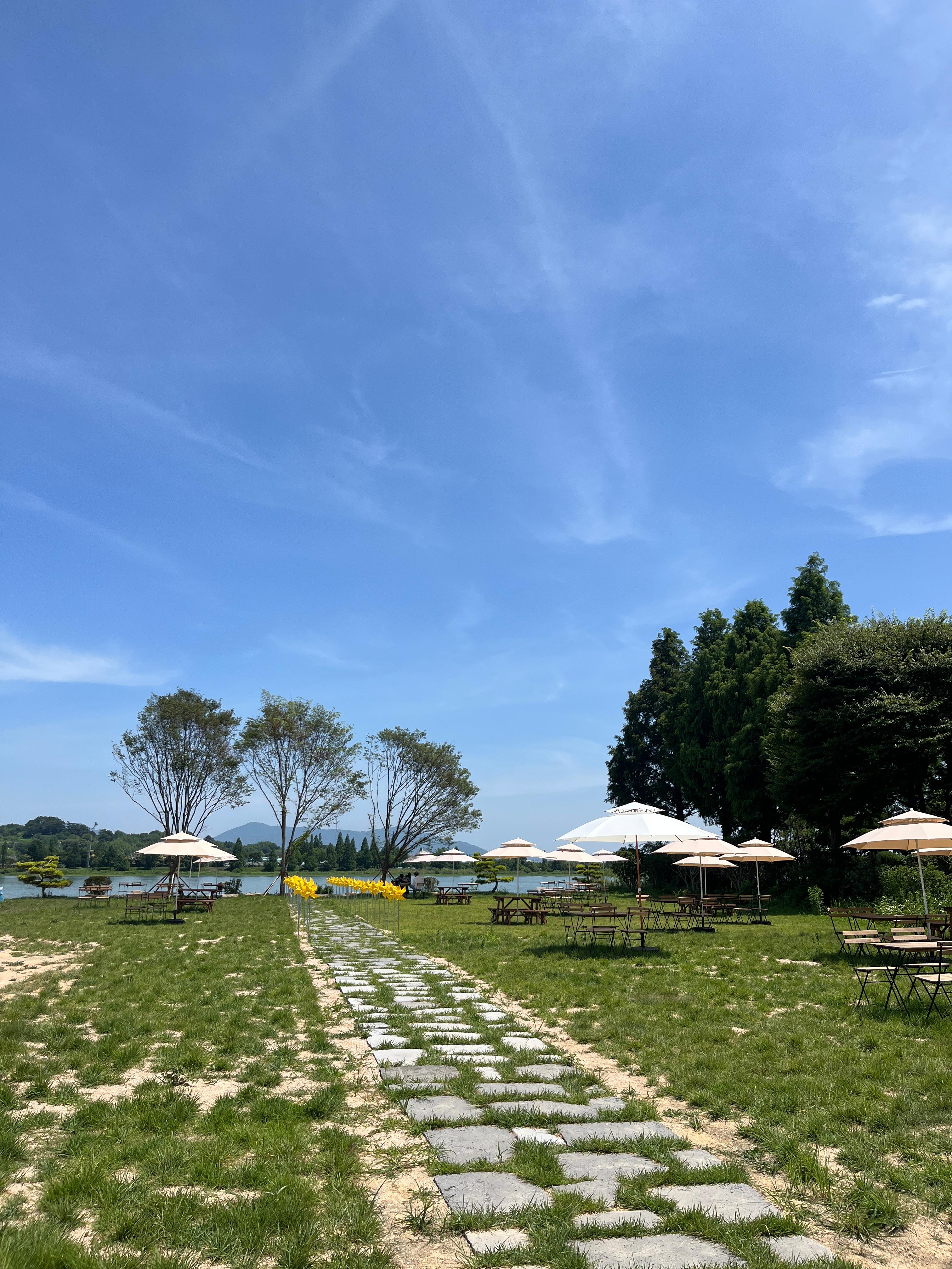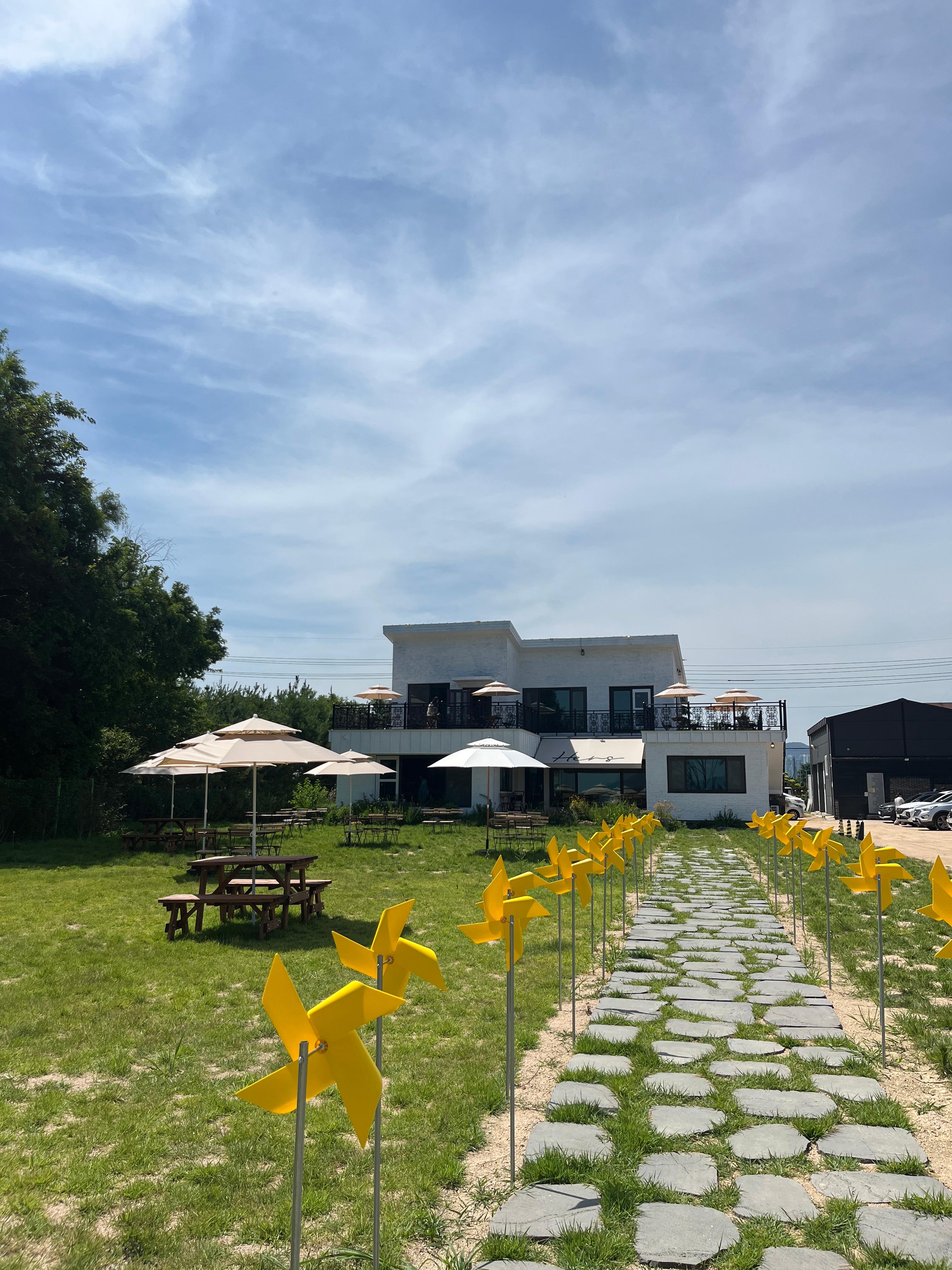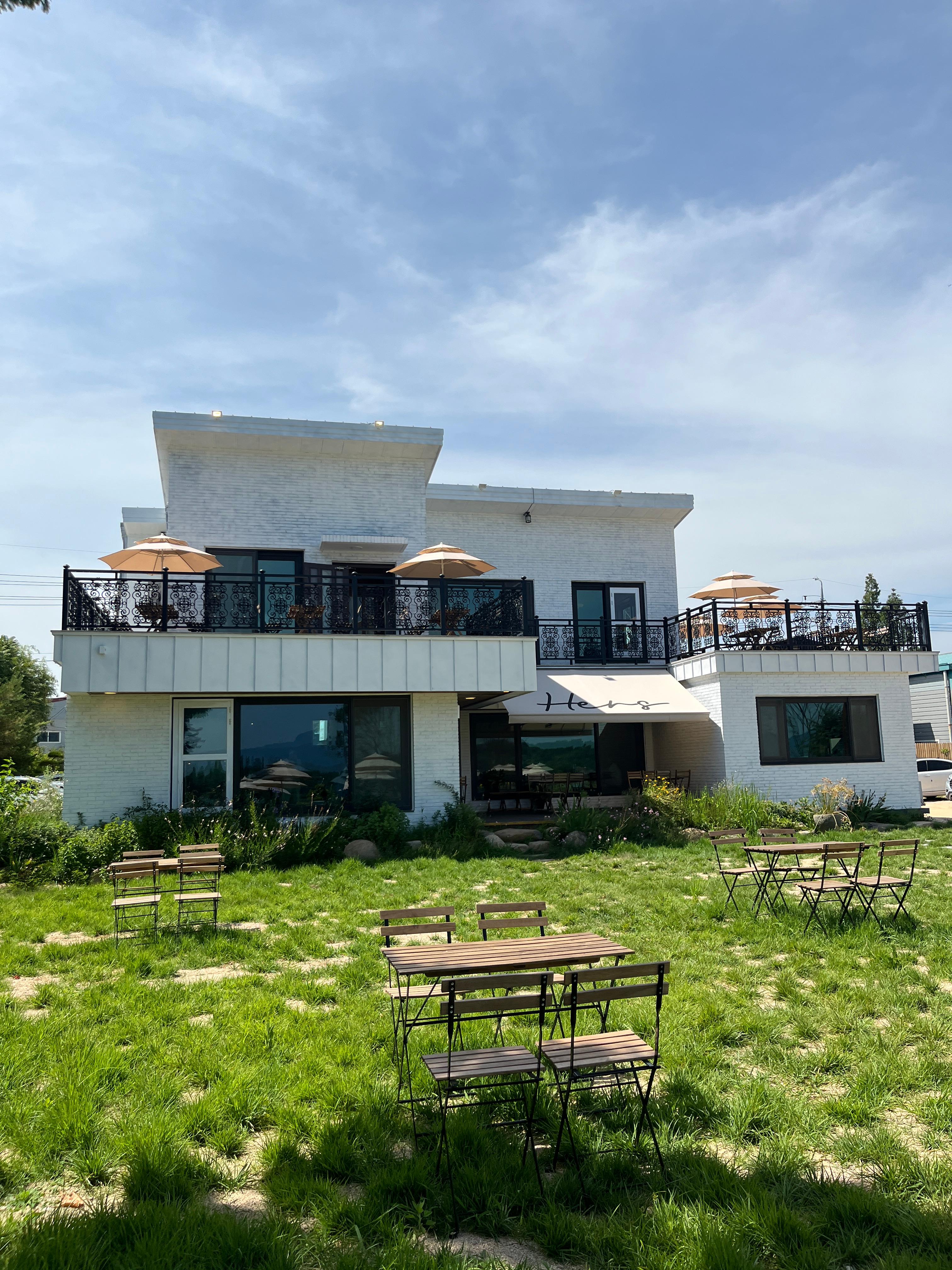 카페 건물 뒤쪽으로 넓은 풀밭과 야외테이블이 많이 있어요