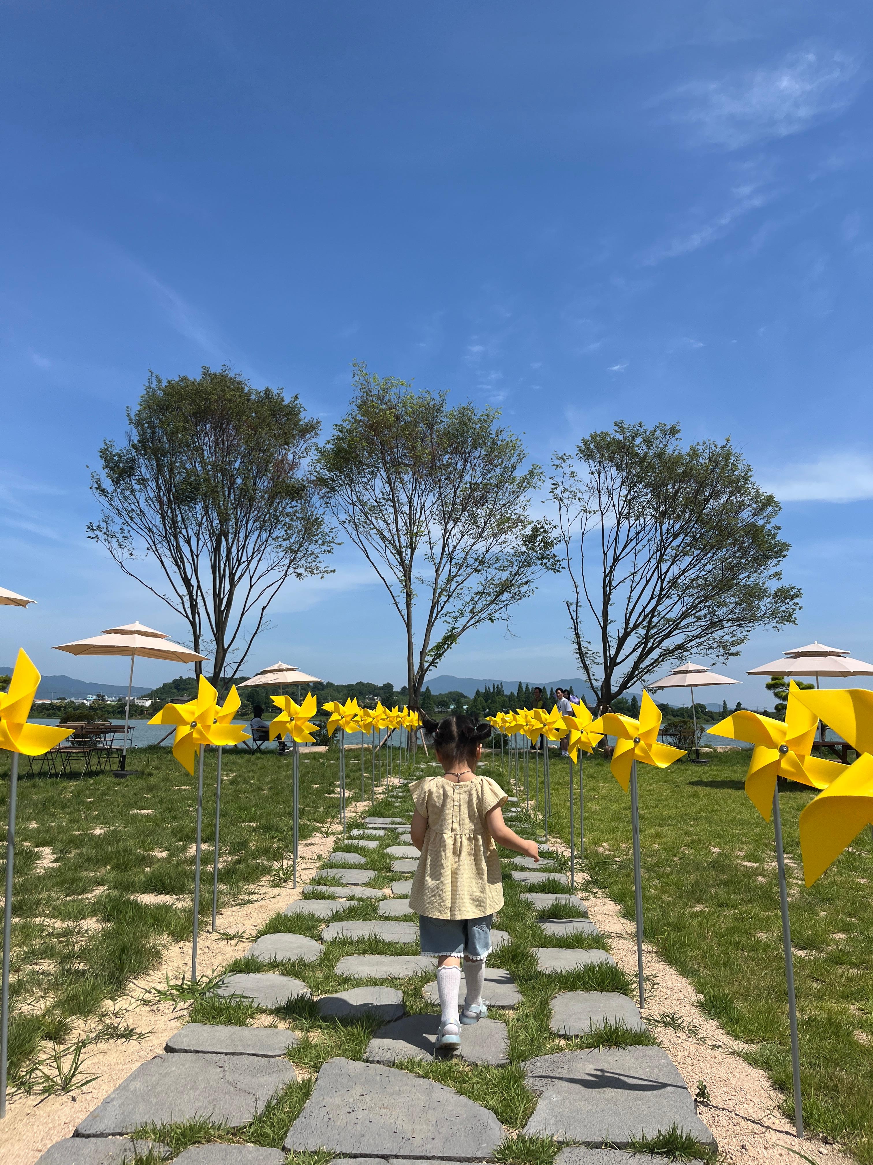강도 잘 보이고, 초록초록한 풀밭과 노란 바람개비가 아름다워요. 자세히 보면 작은 꽃들도 많이 있어요.