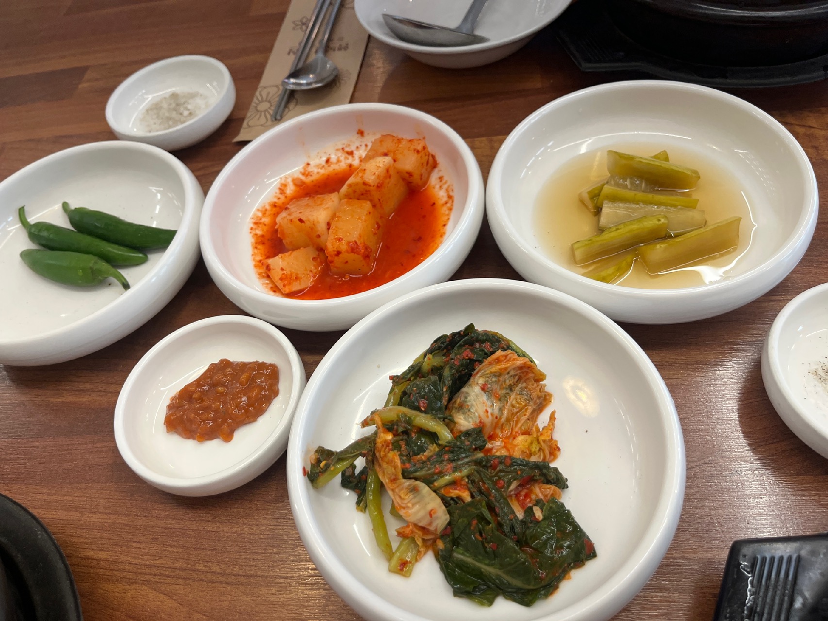 김치, 깍두기, 고추, 양파, 오이피클, 쌈장 등을 마음껏 가져다 먹을 수 있어