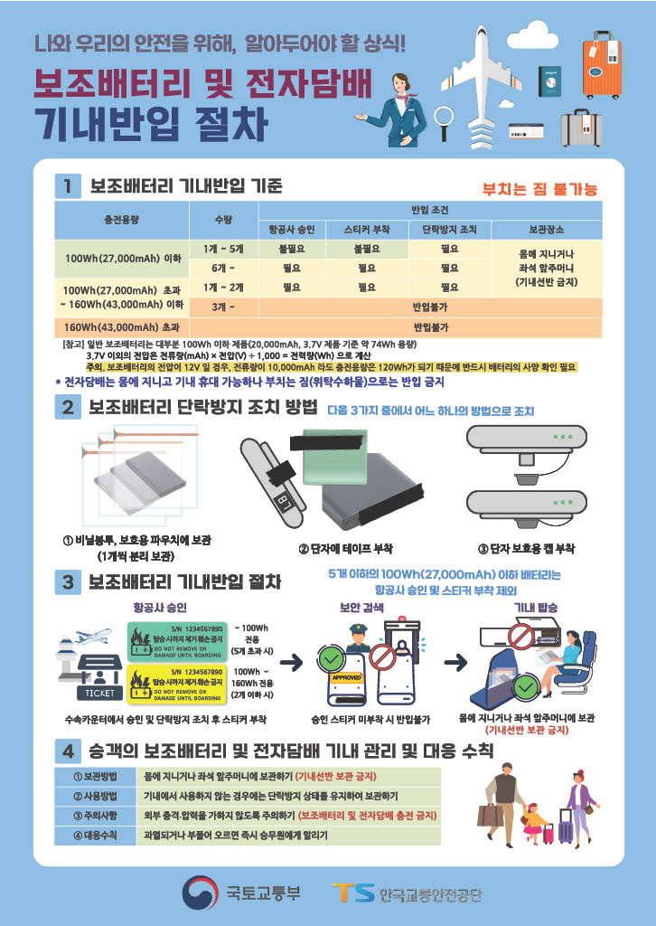 이번 글에서는 국토교통부와 한국교통안전공단이 제공한 공식 안내자료를 토대로 보조배터리 및 전자담배 기내 반입 기준과 주의사항을 쉽게 정리해드릴게요.