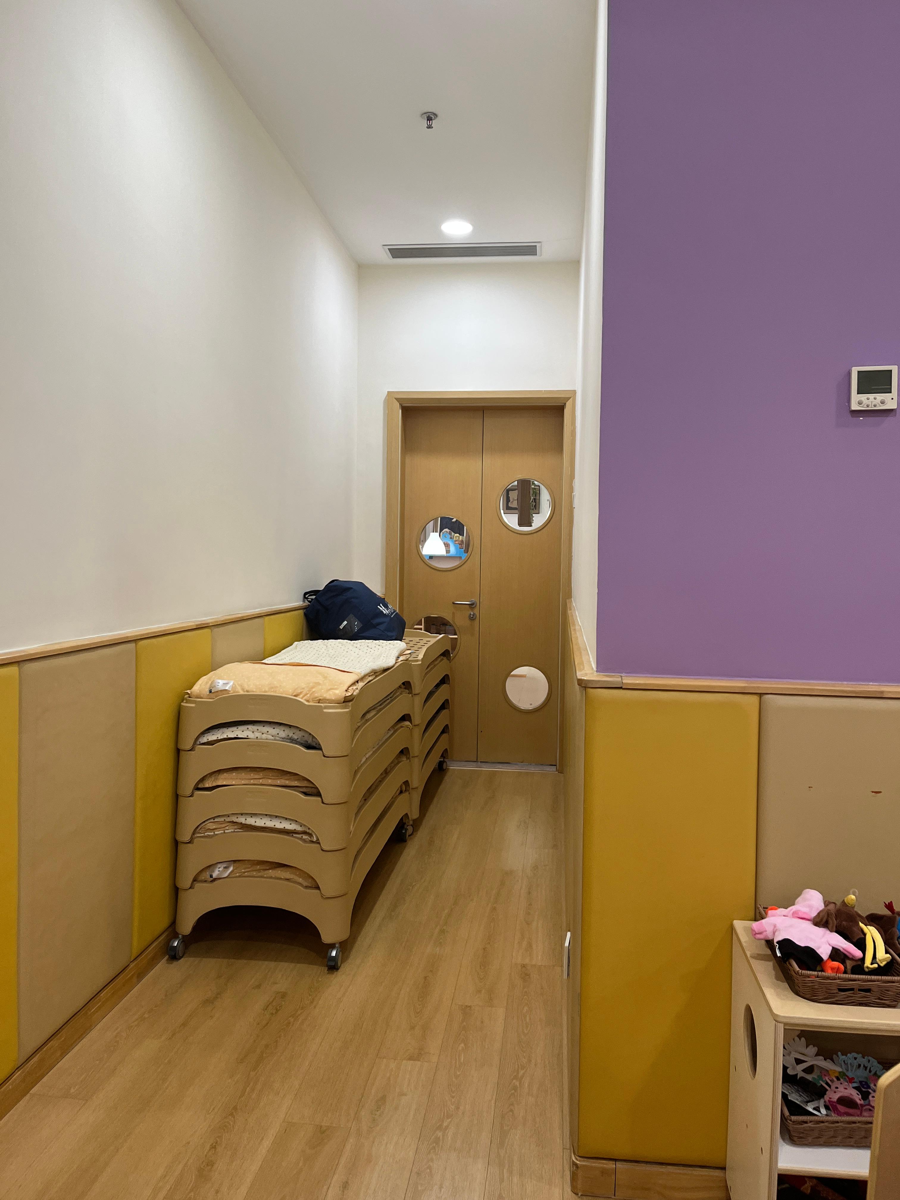 낮잠시간 있구요, 각 교실에 이동용 침대가 있고 개인 이불을 이용해요. 각 교실마다 화장실도 있습니다. 좀 오래된 중국유치원은 스쿼트 자세 화장실도 있는데 덕태는 아동용 좌변기가 있어요.